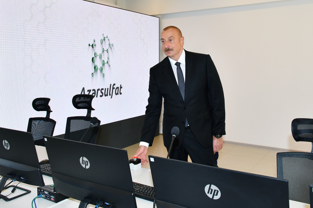 Sonra dövlətimizin başçısı “Azərsulfat” Məhdud Məsuliyyətli Cəmiyyətinin yeni inşa edilmiş sulfat turşusu istehsalı müəssisəsində yaradılan şəraitlə tanış oldu.