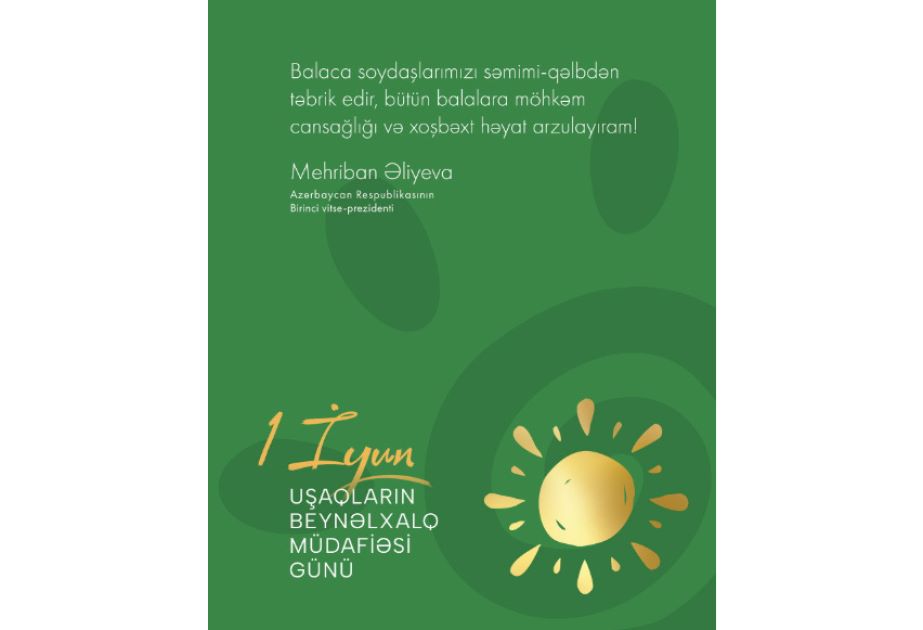 Azərbaycan Respublikasının Birinci vitse-prezidenti Mehriban Əliyeva sosial şəbəkə hesabında 1 İyun – Uşaqların Beynəlxalq Müdafiəsi Günü münasibətilə paylaşım edib.