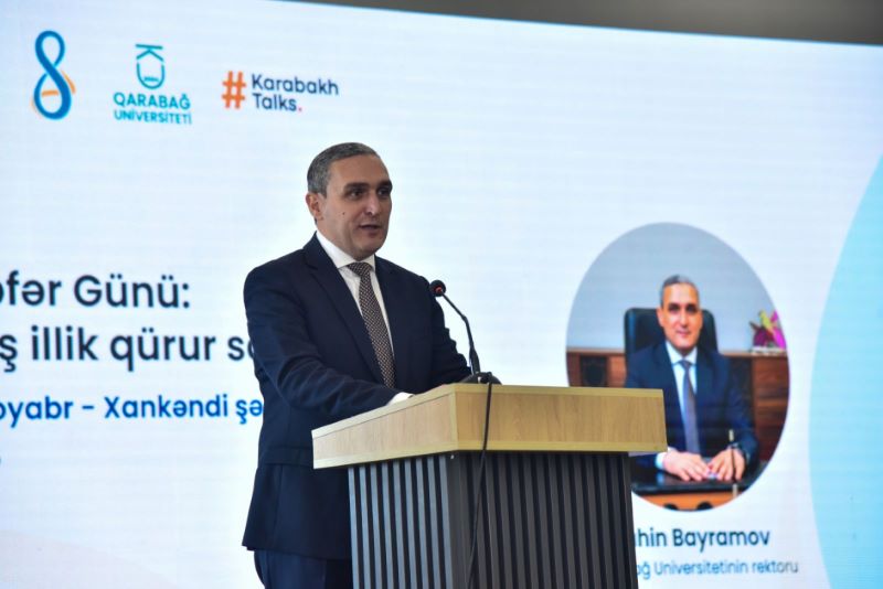 Tədbirdə çıxış edən Qarabağ Universitetinin rektoru Şahin Bayramov bu il xalqımızın qürur və şərəf simvoluna çevrilmiş Zəfər Gününün beşinci ildönümünün qeyd olunduğunu vurğulayaraq, Qarabağ bölgəsində təhsilin inkişafı, eləcə də insan kapitalının gücləndirilməsi istiqamətində görülən işlərdən danışıb.