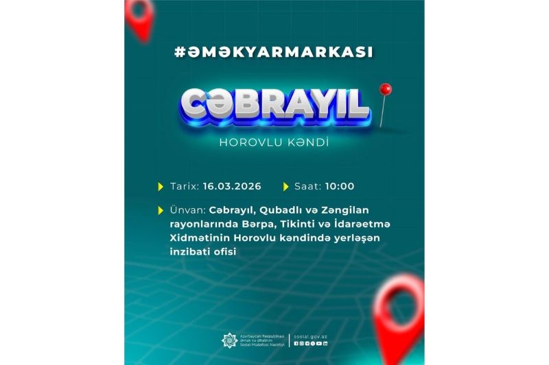 ƏƏSMN-dən verilən xəbərə görə, aktiv məşğulluq tədbiri martın 16-da saat 10:00-da Cəbrayıl, Qubadlı və Zəngilan rayonlarında Bərpa, Tikinti və İdarəetmə Xidmətinin Cəbrayıl rayonunun Horovlu kəndində yerləşən inzibati ofisində keçiriləcək.