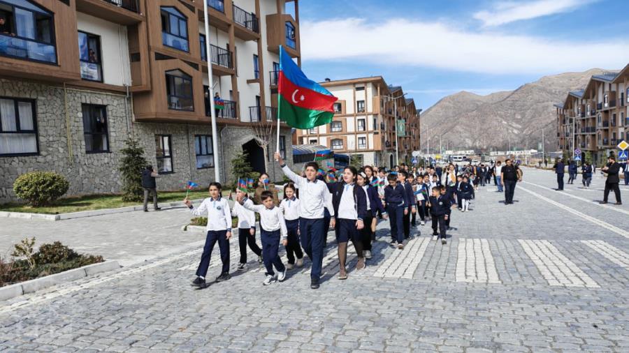 Köçlə gələn ailələri Kəlbəcər şəhərindəki I yaşayış məhəlləsində əlində bayraq tutmuş məktəblilər qarşılayıb, Dövlət Himnini ifa ediblər.