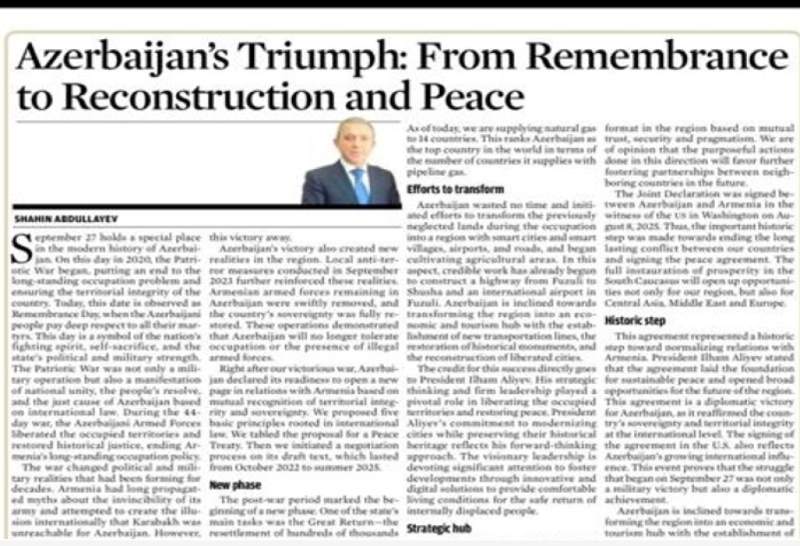 Məqalədə 2020-ci il sentyabrın 27-nin Azərbaycanın tarixində dönüş nöqtəsi olduğu bildirilir. Qeyd olunur ki, həmin gün başlayan 44 günlük Vətən müharibəsi ilə ölkəmizin ərazi bütövlüyü bərpa edilib və Ermənistanın uzun illər davam edən işğal siyasətinə son qoyulub.