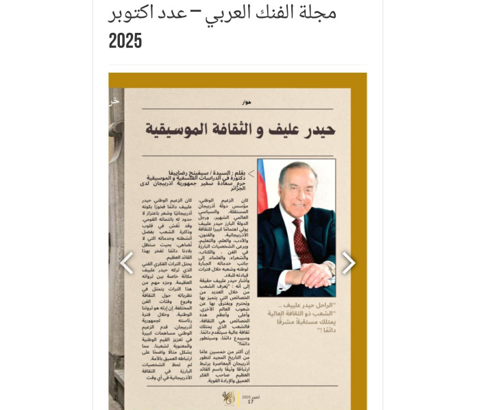 Azərbaycanın Əlcəzairdəki səfirliyindən bildirilib ki, sənətşünaslıq üzrə fəlsəfə doktoru, dosent Sevinc Rzayevanın müəllifi olduğu məqalədə müasir, müstəqil Azərbaycan dövlətinin qurucusu, dünya miqyasında tanınmış siyasətçi və görkəmli dövlət xadimi Heydər Əliyevin ölkəmizin siyasi, iqtisadi və mədəni inkişafında oynadığı tarixi roldan bəhs olunur.