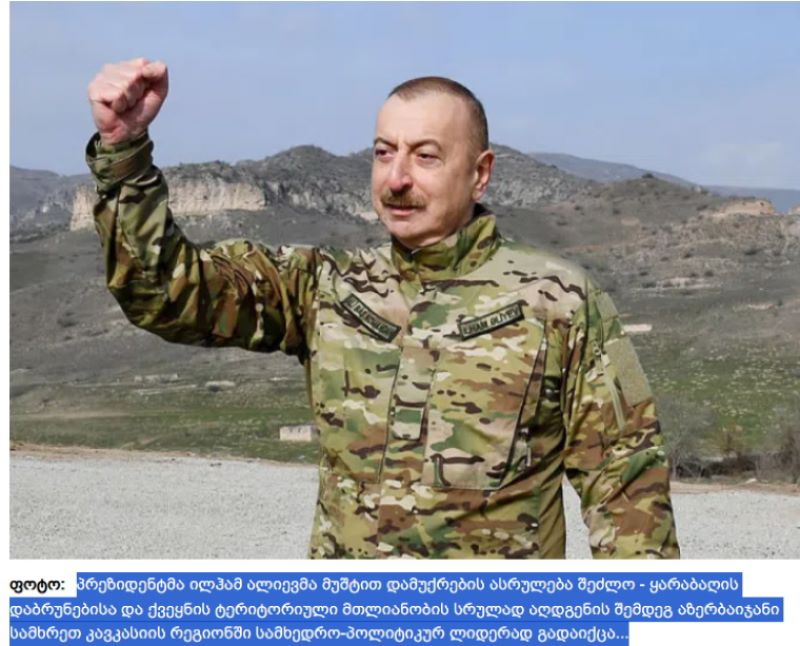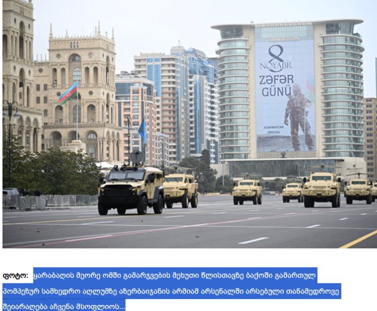 Məqalədə hərbi ekspert İrakli Aladaşvilinin İkinci Qarabağ müharibəsi, onun nəticələri və 8 Noyabr - Zəfər Günü ilə bağlı fikirləri əksini tapıb. Məqalədə yazılıb ki, bu il noyabrın 8-də Azərbaycan İkinci Qarabağ müharibəsində Qələbənin beşinci ildönümünü paytaxt Bakıda möhtəşəm hərbi paradla qeyd etdi.