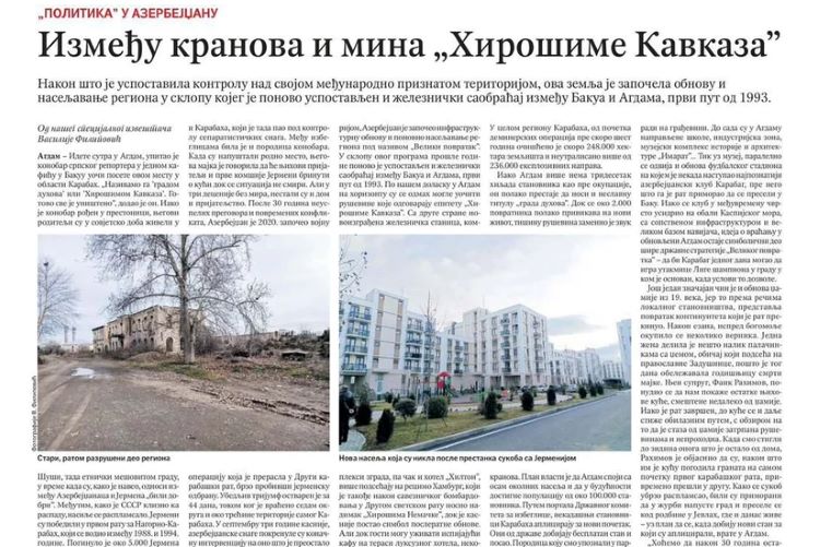 "Kranlar və minalar arasında – Qafqazın Xirosiması" başlıqlı reportajda əsasən Ağdamdan bəhs olunur.