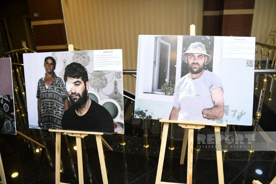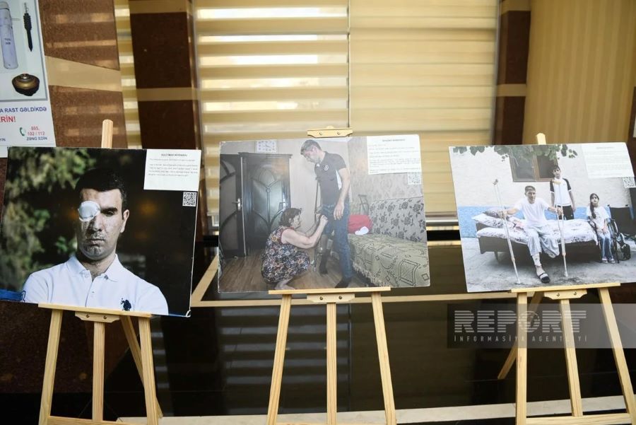 Tədbirin sonunda mina qurbanlarının fotoları, mina və partlamamış hərbi sursatların maketlərin posterlərin nümayiş olunub. (Report)