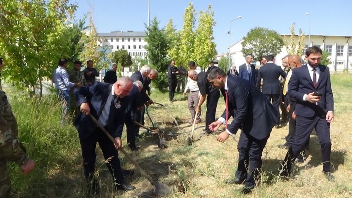 Sonda İğdır Sosial Elmlər Liseyinin həyətində Azərbaycan və Türkiyə qəhrəmanlarının xatirəsinə ağac tingləri əkilib. (AZƏRTAC)