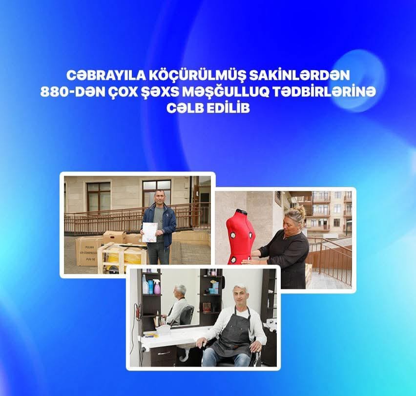 Həmin sakinlərdən artıq 883 şəxs məşğulluq tədbirlərinə cəlb olunub. Onlardan: 811 nəfərin rayon ərazisində məşğulluğu təmin edilib (o cümlədən, rayona köçürülmüş sakinlərdən 40 nəfər üçün özünüməşğulluq proqramı çərçivəsində kiçik təsərrüfatlar yaradılıb)