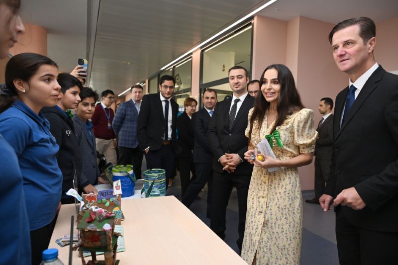 Əvvəlcə Leyla Əliyeva məktəblilərin ətraf mühit problemlərinə, onun həlli yollarına, təbiətin qorunmasına dair ideyalarını əks etdirən əl işlərindən ibarət sərgiyə baxış keçirib.