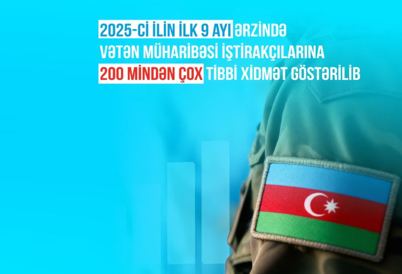 Vətən müharibəsi iştirakçılarının tibbi xidmətlərdən vaxtında yararlanmasının, müayinə və müalicə işinin təşkilinin nəticəsi olaraq 2025-ci ilin ilk 9 ayı ərzində tibb müəssisələrinə ümumilikdə 10 min 805 müharibə iştirakçısı 68 min 373 tibbi xidmət üçün müraciət edib. Bu müraciətlər əsasında onlara 206 min 614 müxtəlif adda tibbi xidmət göstərilib.