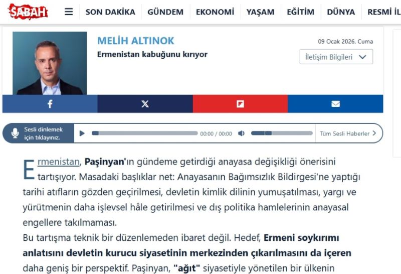 Bu barədə türkiyəli ekspert Melih Altınokun yanvarın 9-da "Sabah" qəzetində dərc olunmuş “Ermənistan qabığından çıxır” sərlövhəli məqaləsində deyilir.