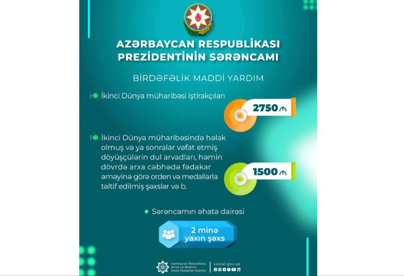 İkinci Dünya müharibəsində həlak olmuş və ya sonralar vəfat etmiş döyüşçülərin dul arvadlarına, həmin dövrdə arxa cəbhədə fədakar əməyinə görə orden və medallarla təltif edilmiş şəxslərə, İkinci Dünya müharibəsi illərində döyüş cəbhələrinin arxa hüdudları, yaxud döyüşən donanmaların əməliyyat zonaları daxilində ordunun və donanmanın mənafeyi üçün tapşırıqları yerinə yetirmiş xüsusi birləşmələrin işçilərinə, İkinci Dünya müharibəsi dövründə Leninqrad şəhərinin müdafiəsinə görə müvafiq medal və döş nişanı ilə təltif edilmiş şəxslərə, habelə Leninqrad şəhərinin mühasirəsi iştirakçılarına isə 1500 manat məbləğində birdəfəlik maddi yardım veriləcək.