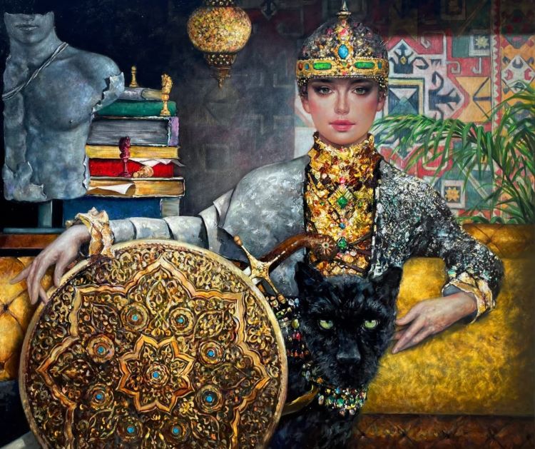 Sərgidə xüsusi diqqət çəkən digər bir məqam isə qadın portretləridir. Burada qadın obrazı təkcə estetik element deyil, həm də keçmişlə əlaqə, ruhun dərin qatları və müasirlikdə qadının özünü ifadəsi kimi təqdim olunur. Xalça motivləri bu obrazların üzərində köklü mənalar formalaşdırır, onları zaman və məkan anlayışlarından daha geniş bir kontekstdə təqdim edir.