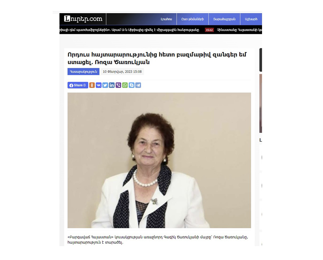 İş adamı, "Çiçəklənən Hayastan" partiyasının sədri Qaqik Çarukyanın anası Roza Çarukyanın "Lurer.com" tərəfindən yayılmış "Oğlumun bəyanatından sonra çoxlu zənglər alıram" başlıqlı yazıda qeyd olunur ki, doğulan hər bir uşaq Allahın valideyinə mükafatıdır. Laçın- Xankəndi yolu "bağlanandan" bəri kiçik "arsax"da 215 uşaq doğulub və oğlu onlara boyunlarında gəzdirmək üçün xaç bağışlayıb. "Onlar Allahın bütün dünyaya böyük mükafatıdır",- deyə o hamını həmin uşaqların "müqəddəsliyini" qəbul etməyə çağırıb.