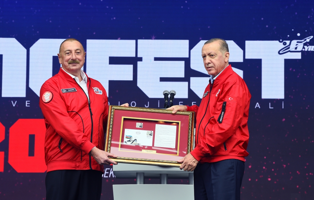 Bu gün “TEKNOFEST”də iştirak edərkən “TEKNOFEST”in qurucusu, əziz qardaşımız Selçuk Bayraktarın xidmətlərini də qeyd etmək istərdim. Selçuk bəy Azərbaycanda dəfələrlə olmuş, o cümlədən azad edilmiş torpaqlarda, Şuşada. Son gəlişində - aprelin 3-də Azərbaycanda olarkən biz gələcək işbirliyi haqqında danışdıq və Azərbaycanda “Bayraktar” mərkəzinin yaradılması haqqında razılığa gəldik. İnşallah, yaxın gələcəkdə Azərbaycanda “Bayraktar” mərkəzi yaradılacaq, orada təhsil, xidmət, istehsal da olacaqdır. Selçuk bəy Bakıda olarkən “Kızılelma”nın bir maketini hədiyyə etdi. Mən fürsətdən istifadə edərək “Kızılelma” ilə bağlı bütün qardaşlarımızı təbrik etmək istəyirəm və ümid edirəm ki, yaxın gələcəkdə “Kızılelma” Azərbaycanın səmasında da olacaqdır. “Kızılelma” havada, “Altay” və “Togg” quruda, “Anadolu” dənizdə - bugünkü Türkiyə budur.