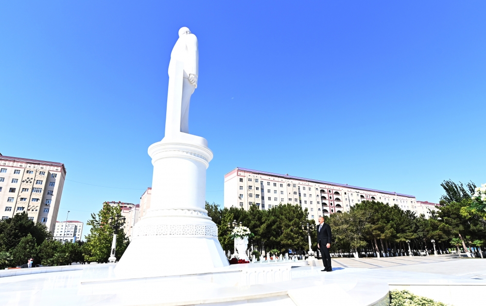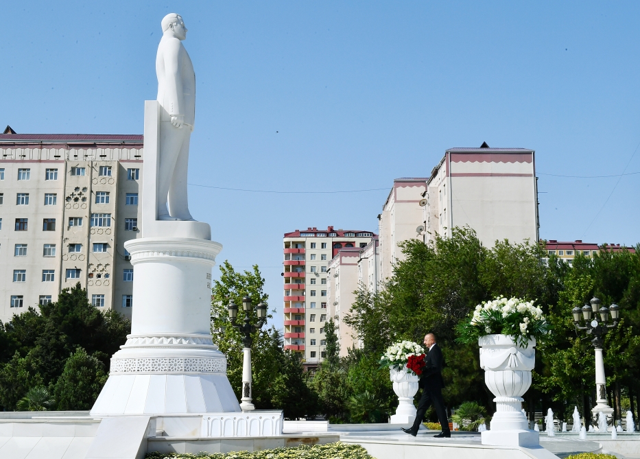 Prezident İlham Əliyev Sumqayıtda ulu öndər Heydər Əliyevin abidəsini ziyarət edib