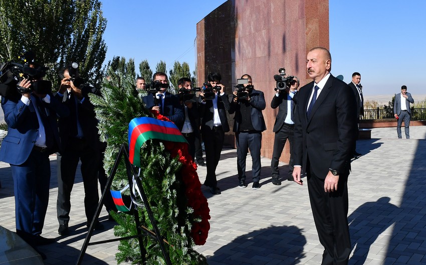 Prezident İlham Əliyev abidənin önünə əklil qoyub.