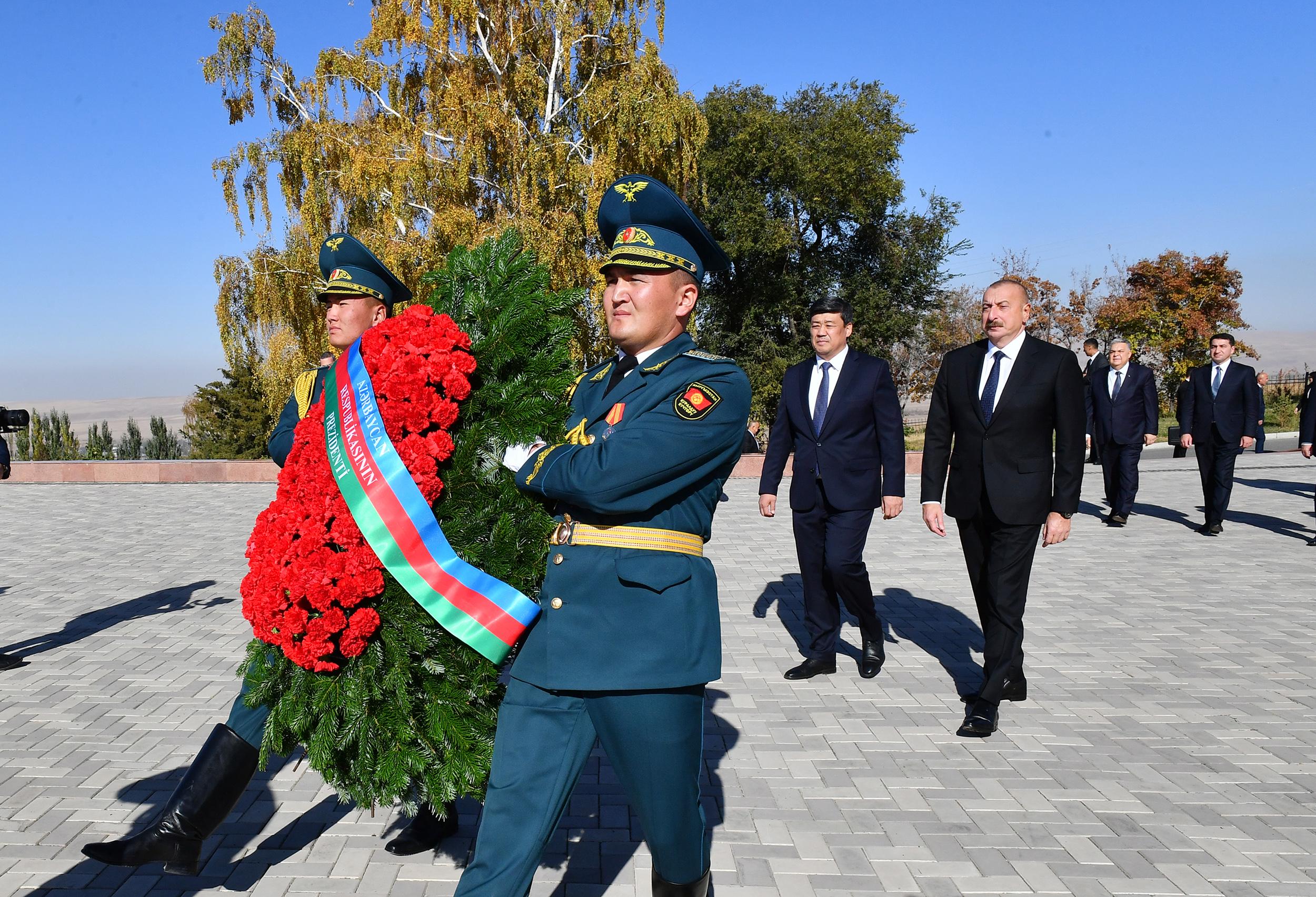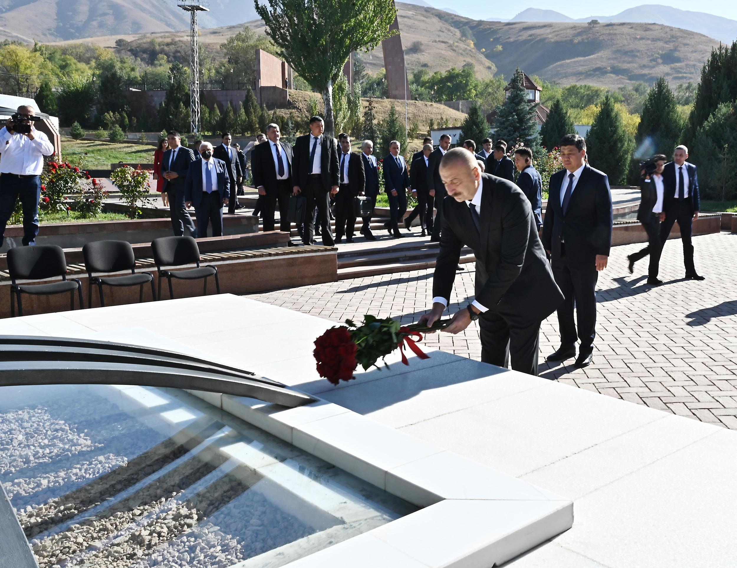 Dövlət başçısı görkəmli qırğız yazıçısı Çingiz Aytmatovun məzarını da ziyarət edib və üzərinə gül dəstəsi qoyub.
