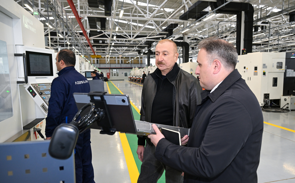 Dövlətimizin başçısı əvvəlcə Ulu Öndər Heydər Əliyevin zavodun həyətində ucaldılmış büstü önünə gül dəstəsi qoydu.
