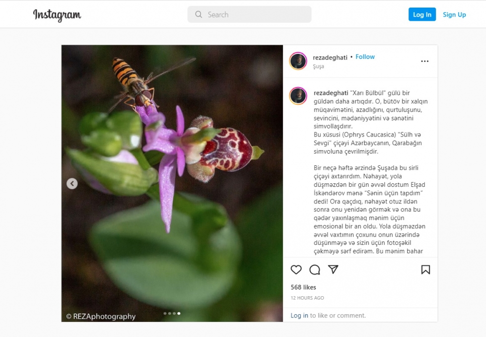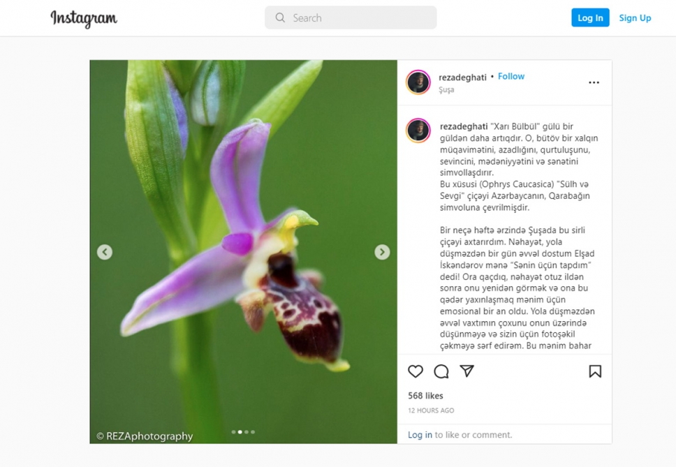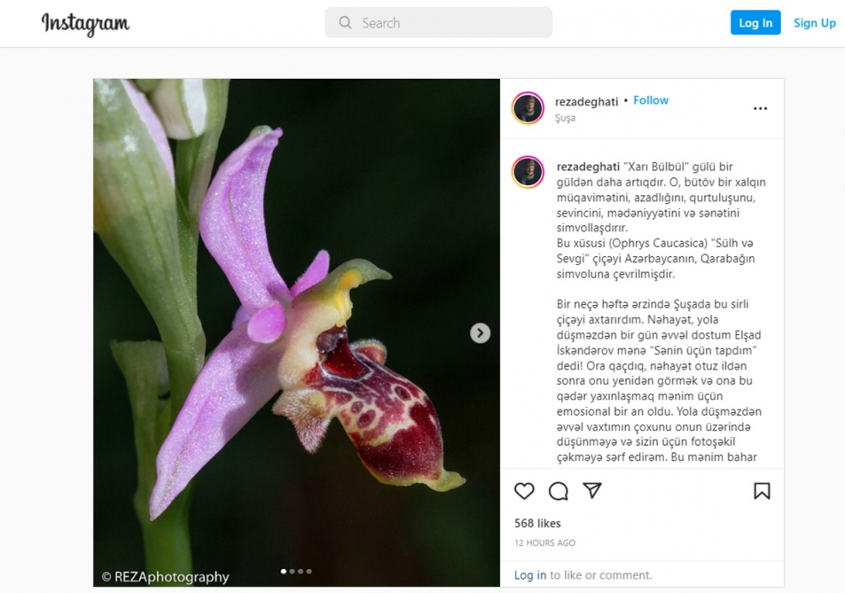 Bir neçə həftə ərzində Şuşada bu sirli çiçəyi axtarırdım. Nəhayət, yola düşməzdən bir gün əvvəl dostum Elşad İskəndərov mənə “Sənin üçün tapdım” dedi! Ora qaçdıq, nəhayət, otuz ildən sonra onu yenidən görmək və ona bu qədər yaxınlaşmaq mənim üçün emosional bir an oldu. Yola düşməzdən əvvəl vaxtımın çoxunu onun üzərində düşünməyə və sizin üçün fotoşəkil çəkməyə sərf edirəm. Bu mənim bahar hədiyyəmdir!”. (AZƏRTAC)