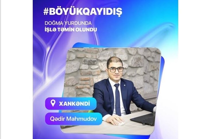 Əslən Laçın rayonundan olan Qədir Mahmudov Dövlət Məşğulluq Agentliyinin Qarabağ Regional Məşğulluq filialında işlə təmin olunub və bu gün də böyük qürurla karyerasına davam edir.