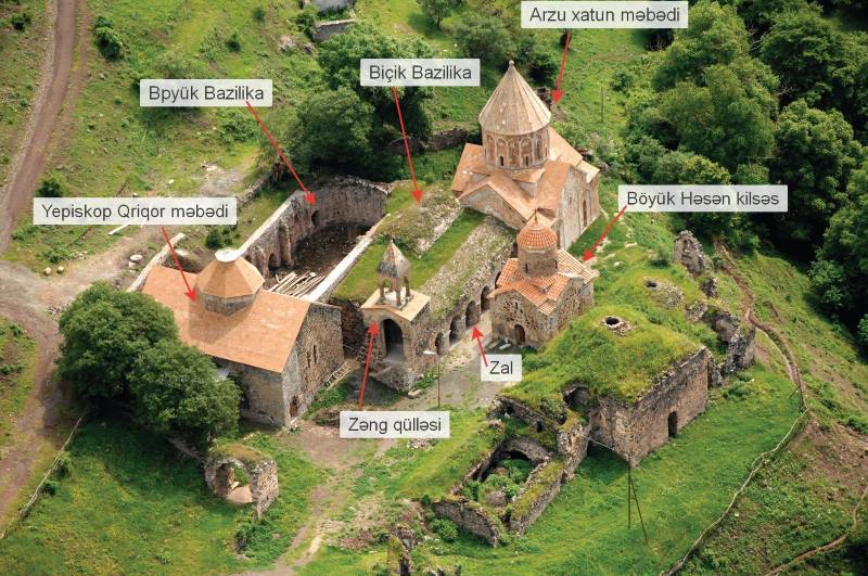 Kompleksin ən erkən tikilisi VIII–IX əsrlərə aid edilən qədim bazilikadır. Həmin tikili Müqəddəs Faddeyin göstərişi ilə xristianlığı təbliğ etmək üçün gəlmiş və Abqar adlı yerli hakim tərəfindən öldürülmüş Həvari Dadinin məzarı üzərində inşa edilib. Kafedral statusu daşıyan Arzu xatun kilsəsi isə 1214-cü ildə Yuxarı Xaçın knyazı Vaxtanqın həyat yoldaşı tərəfindən inşa olunub. Monastrın ərazisindəki tikililər bunlar olub: qədim bazilika, Arzu Xatun kilsəsi, Böyük Həsən kilsəsi, Kiçik bazilika, Yepiskop Qriqor kilsəsi, Zəng qülləsi.