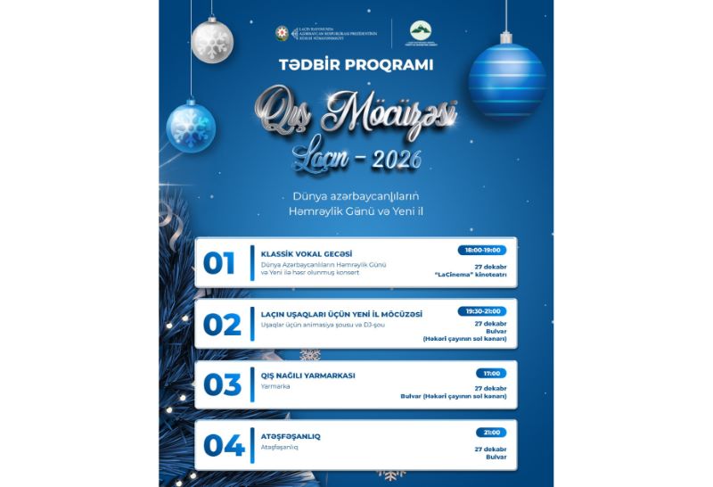 Axşam “Lacinema” kinoteatrında Həmrəylik Günü və Yeni ilə həsr olunmuş klassik vokal gecəsi, bulvarda “Yeni il möcüzəsi” adlı animasiya proqramı və DJ şou təşkil ediləcək.