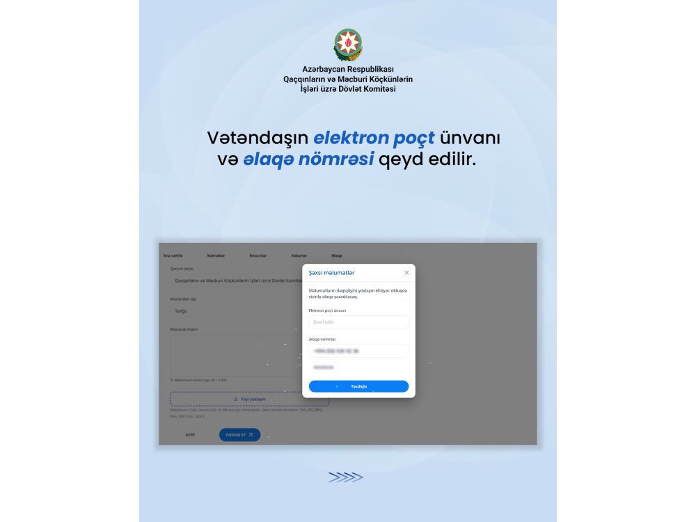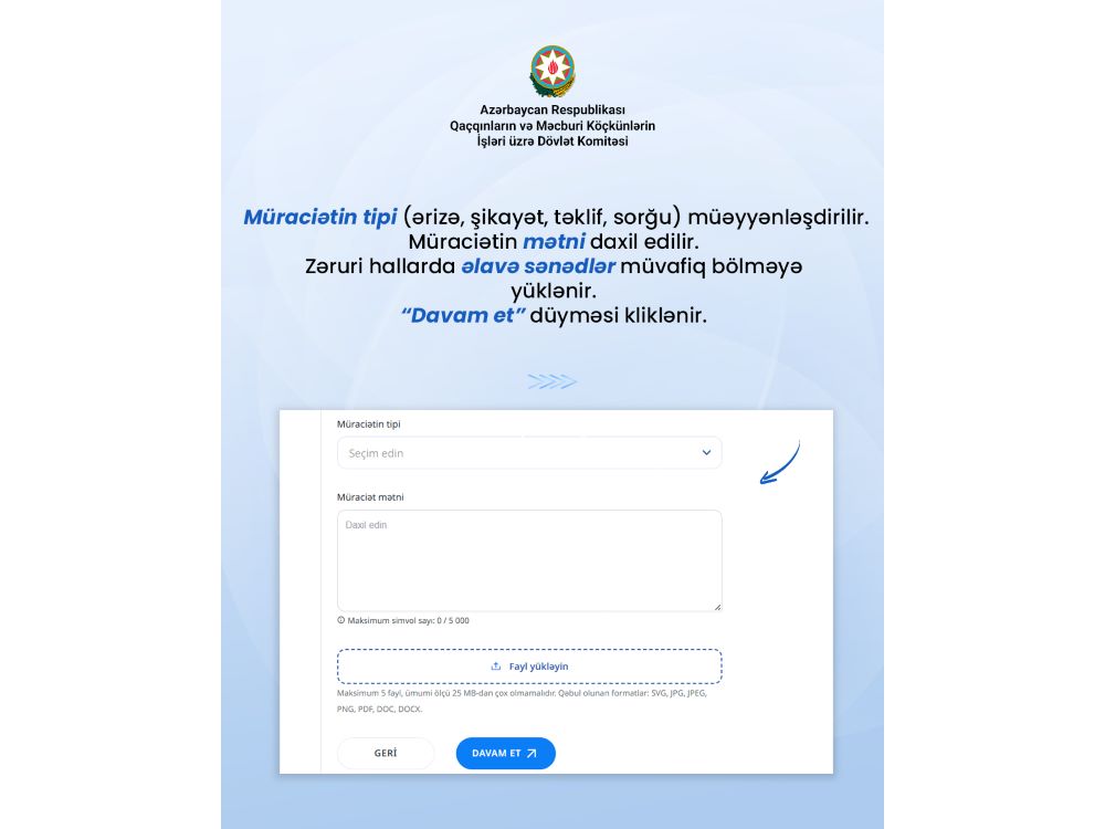 Portala daxil olduqdan sonra Ana səhifədə yerləşən müraciət bölməsindən “Dövlət qurumlarına müraciət” seçilir. Açılan bölmədə “Müraciət et” düyməsi klik edilir. Dövlət qurumlarının siyahısından Qaçqınların və Məcburi Köçkünlərin İşləri üzrə Dövlət Komitəsi seçilir, “müraciətin tipi” - ərizə, şikayət, təklif, sorğu - müəyyənləşdirilir. Daha sonra müraciət mətni daxil edilir. Müraciətə əlavə edilməsi istənilən digər sənədlərin zəruri bölməyə yükləndikdən sonra “Davam et” düyməsi seçilir. Bu zaman vətəndaşın fərdi elektron poçt ünvanı və əlaqə nömrəsi qeyd edilir.