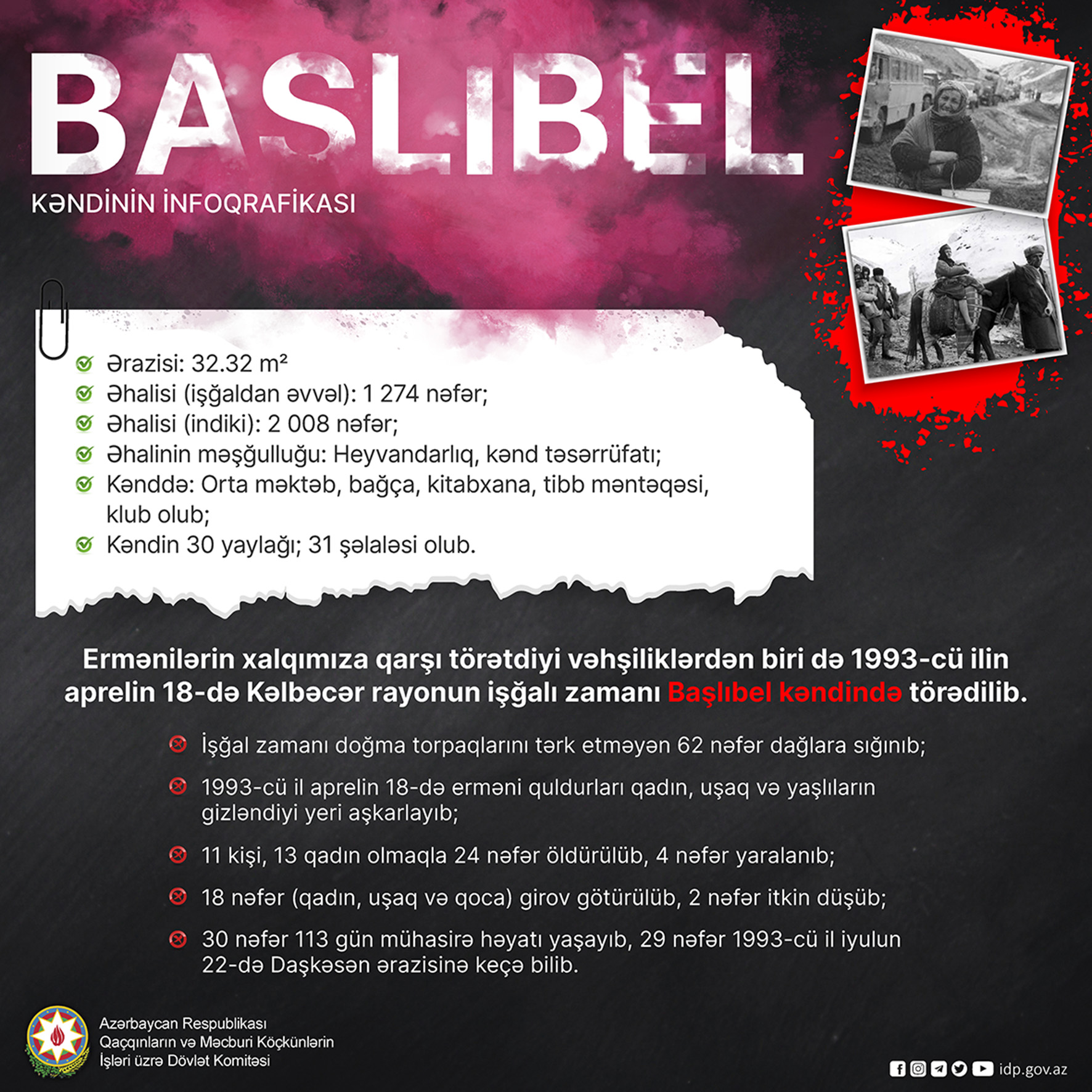 İnfoqrafikada isə Başlıbel kəndinin ərazisi, əhalisi və onların əsas məşğulluğu haqqında məlumat verilib. Eyni zamanda, kəndin işğalı nəticəsində törədilən cinayətlərin statistikası haqqında informasiya yerləşdirilib.