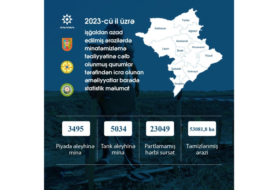 ANAMA-dan bildiriblər ki, Tərtər, Kəlbəcər, Ağdam, Xankəndi, Laçın, Xocavənd, Şuşa, Füzuli, Qubadlı, Cəbrayıl və Zəngilan rayonlarının ərazilərində aparılmış minatəmizləmə əməliyyatları zamanı piyada əleyhinə 3495, tank əleyhinə 5034 mina və 23 min 49 ədəd partlamamış hərbi sursat aşkarlanaraq zərərsizləşdirilib.