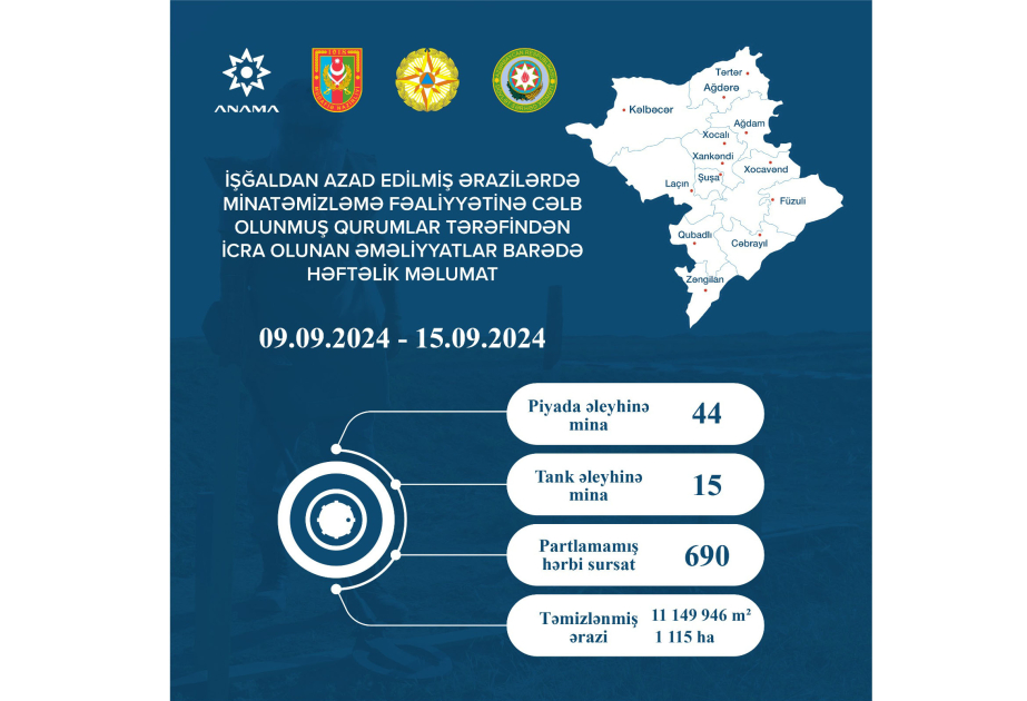 ANAMA-dan verilən məlumata görə, sentyabrın 9-dan 15-dək Tərtər, Ağdərə, Kəlbəcər, Ağdam, Xocalı, Xankəndi, Xocavənd, Laçın, Şuşa, Füzuli, Qubadlı, Cəbrayıl və Zəngilanda aparılmış minatəmizləmə əməliyyatları zamanı piyada əleyhinə 44, tank əleyhinə 15 mina və 690 partlamamış hərbi sursat aşkarlanaraq zərərsizləşdirilib.