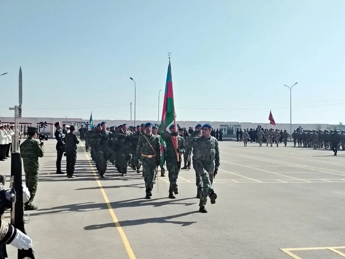 Sonda təlimdə iştirak edən hərbi qulluqçuların tribuna önündən təntənəli keçidi olub.(Report)