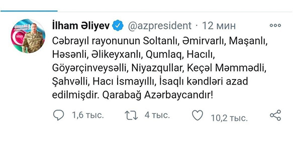 • Rəşadətli Azərbaycan Ordusu Füzuli rayonunun Arış, Cəbrayıl rayonunun Doşulu, Xocavənd rayonunun Edişə, Düdükçü, Edilli, Çiraquz kəndlərini işğaldan azad edib. Prezident İlham Əliyev bununla bağlı rəsmi tviter səhifəsində paylaşım edib.
