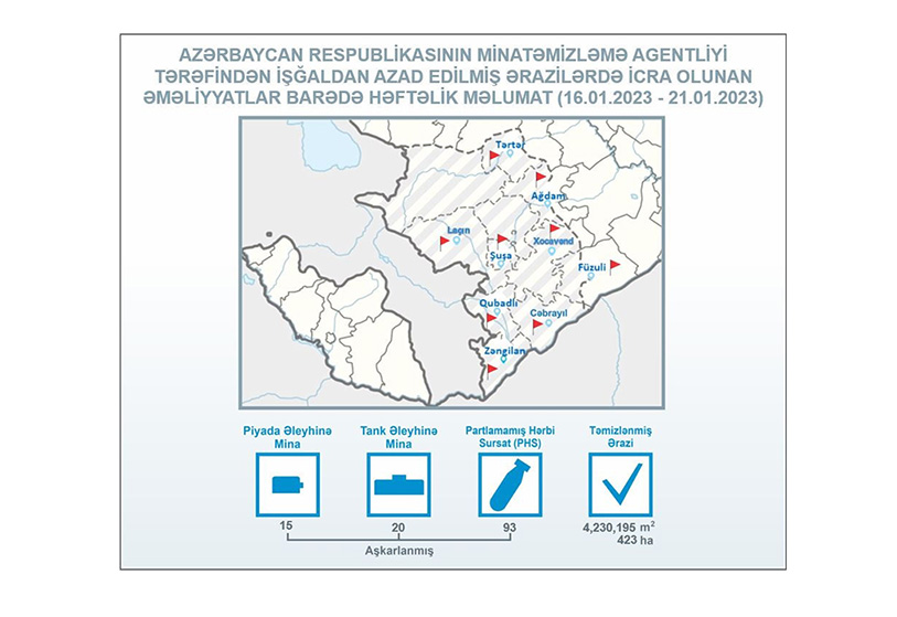 ANAMA-dan bildirilib ki, yanvarın 16-dan 21-dək Tərtər, Ağdam, Füzuli, Şuşa, Qubadlı, Xocavənd, Laçın, Cəbrayıl və Zəngilanda 15 piyada əleyhinə mina, 20 tank əleyhinə mina və 93 Partlamamış Hərbi Sursat (PHS) aşkarlanıb.