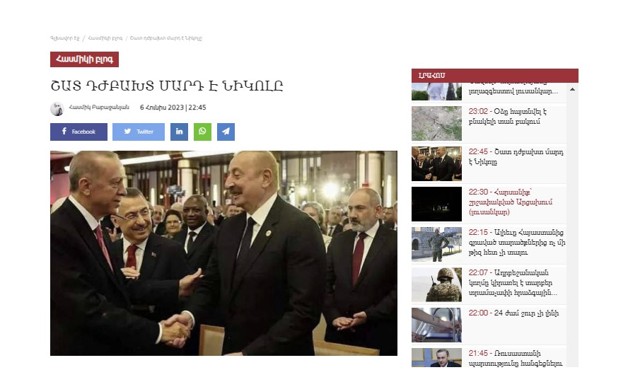 Türkiyə Prezidenti R.T.Ərdoğanın andiçmə mərasimində Nikoldan başqa hamının gülərüzlü olmasını vurğulayan müəllif əlavə edir ki, həm Azərbaycan, həm də Ermənistan mətbuatı Nikolun bədbin duruşu barədə müxtəlif yazılar, şəkillər dərc edib yayır. Ermənistan mətbuatının niyə belə etdiyini başa düşdüyünü deyən jurnalist qadın belə bir fikri xüsusi vurğulayır ki, Azərbaycan mətbuatı Nikolu tənqid etməməlidir, çünki o, öz fəaliyyəti ilə onlara çox yaxşılıqlar edib. Qəribə məntiq deyilmi?