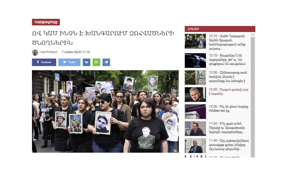Müharibədə ölən əsgərlərin valideynlərinin yaratdığı "Övladların çağırışı" təşkilatının sədri Vahid Sahakyanın sözügedən durumu şərh etməsi isə müxbir Hayk Gevorkyanı qane etməyib. Jurnalist yazıb ki,ölən əsgərlərin valideynləri Qayane Hakopyan azad edilməyincə meydanda aksiya keçirəcəklərini bildirmişldilər. Amma 3 gündən sonra onlar dağılışıblar. Dünənki məhkəmə iclasını onlardan çox az adam, özü də məhkəmə binasının həyətində izləyib. Vəkilin sözləri isə nəzərə alınmayıb ki, bu da insan haqlarının pozulmasının növbəti təzahürüdür.