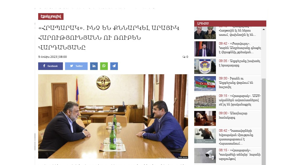 - "Hraparak"ın bu gün səhər tezdən yaydığı xəbərdə göstərilir ki, Xankəndidəki banda başçıları Araik Harutyunyan və Ruben Vartanyan dünən qapalı şəraitdə görüşüblər. İki banda başçısının görüşünün səbəbi isə Rubenin ötən həftə "arsaxın təhlükəsizliyi və tərəqqisi ictimai cəbhəsi" adlı yeni banda yaradaraq bəyanat yaymasına münasibət sərgilənməsi olub.