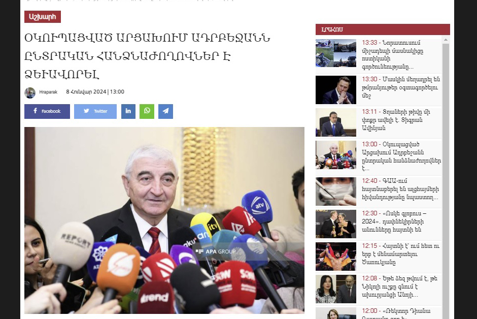 Azərbaycanda keçiriləcək növbədənkənar prezident seçkisi ilə bağlı məlumat verən MSK-nın sədri Məzahir Pənahovun işğaldan azad olunmuş ərazilərdə seçki məntəqələrinin yaradılması və sözügedən yerlərin də hər cür texniki vasitələrlə təmin edilməsi barədə açıqlaması ermənilər arasında növbəti çaxnaşmaya səbəb olub. Bu, "Hraparak"ın bu gün paylaşdığı xəbərdən də açıq-aydın görünür. Diqqət çəkən, reallıqdan məhrum bir məqam isə odur ki, Ermənistanın legitim hakimiyyəti mətbuatda "arsax, işğal, etnik təmizləmə" və s. ifadələrin işlənməməsi ilə bağlı təlimatlar versə də ermənilər hələ də öz xülyalarından əl çəkə bilmirlər. Görünür, başları hələ də ayılmayıb.