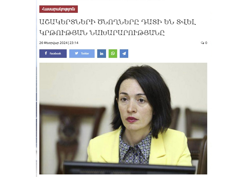 "Hraparak"ın bu günkü yayımında isə bildirilir ki, 7-ci sinif şagirdləri və onların valideynləri təhsil nazirinə qarşı inzibati məhkəmədə iddia qaldırıblar. Bu xəbəri onların vəkili Ara Zohrabyan verib və əlavə edib ki, məhkəmədən xahişimiz var: Movses Xorenaçinin yazdığı tarixi S.Hovhannisyanın müəllifi olduğu 7-ci sinif üçün tarix dərsliyində təhrif etməsinlər, təhsil,elm, mədəniyyət və idman nazirliyinin 03.08.2023-cü il tarixli 1342-S/2 saylı əmrini ləğv etsinlər.