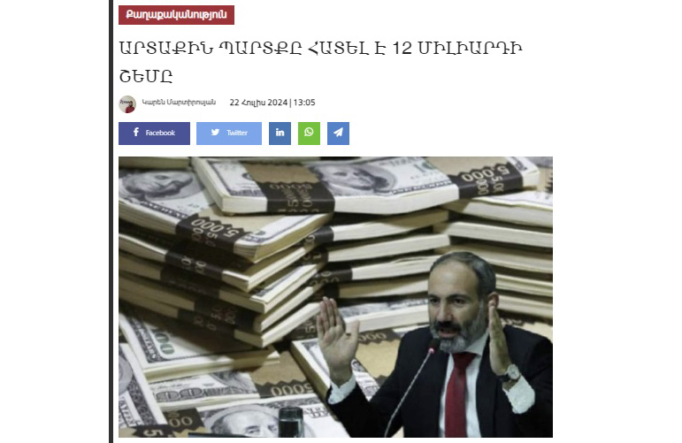 O, deyib ki, hakimiyyətin səriştəsizliyi özünü bütün sahələrdə göstərir. Ölkənin xarici dövlət borcu 12 milyard dolları ötüb ki, bu hər bir vətəndaşı üçün 4 min dollardan çoxdur. Vəsaitin əsassız istiqamətlərdə xərclənməsindən gileylənən deputat sonda deyib ki, hər dəfə asfaltı təzələməklə gözümüzə kül üfürürlər. Uşaqlar isə anadan min dollarlarla borcla doğulurlar. Bu isə əminliklə deməyə əsas verir ki, Ermənistan bataqlıqdan çıxa bilməyəcək.