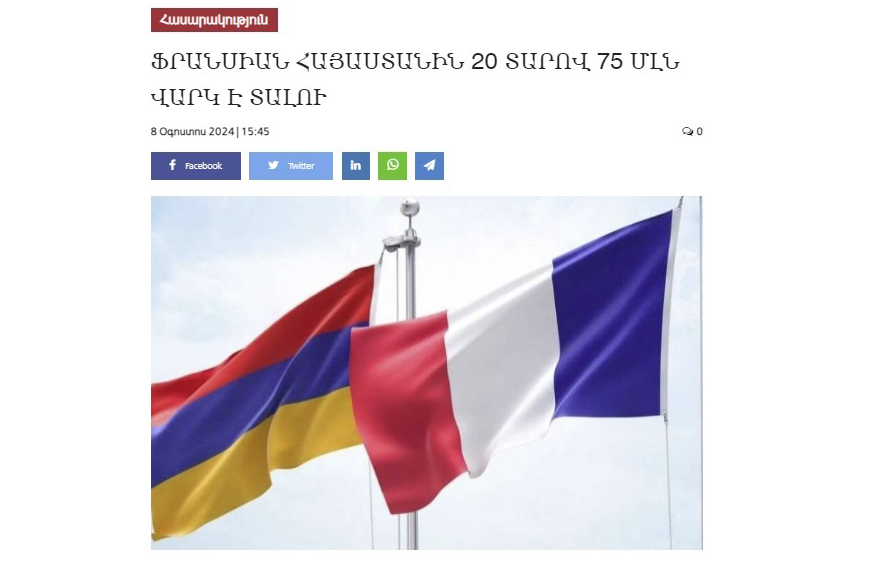 - Ermənistan hökumətinin bu günkü iclasında bildirilib ki, bu il iyunun 26-da Ermənistan və Fransa arasında bağlanmış müqaviləyə əsasən ictimai maliyyə sisteminin idarə edilməsinin yaxşılaşdırılması məqsədilə Fransa Ermənistana 20 il müddətinə 75 milyon avro məbləğində güzəştli kredit verəcək.