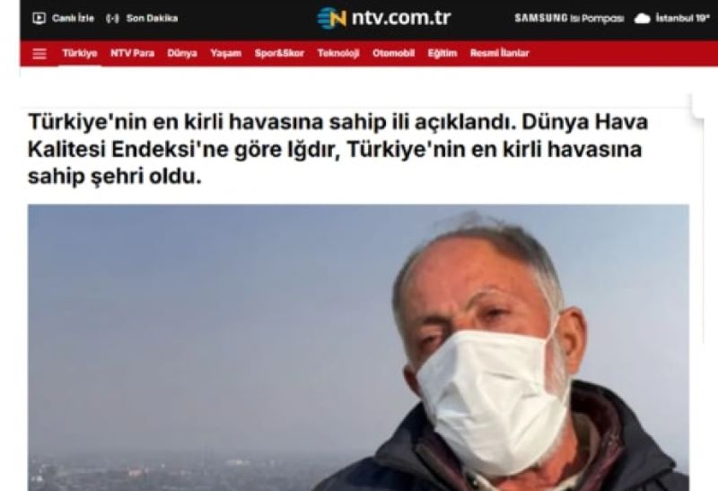 Türkiyənin telekanalı, həmçinin İğdırda hava çirkliliyinin anormal dərəcədə yüksək səviyyədə olmasını ictimai sağlamlıq üçün ciddi problem kimi qeyd edib. “İğdır hazırda hava çirkliliyinə görə Türkiyənin 81 əyaləti arasında birinci yerdədir. İctimai təşkilatların məlumatına görə, əyalətin hər üç sakinindən biri hava çirkliliyinin təsirindən ölür. İğdır şəhərini əhatə edən dağlar hava axınını ləngidir. Vəziyyətə, həmçinin istilik üçün kömürdən aktiv istifadə edilməsi təsir edir”, - deyə reportajda bildirilir və qeyd olunur ki, İğdır sakinlərinin bir hissəsi çölə çıxarkən maska taxmaq məcburiyyətində qalır. (AZƏRTAC)