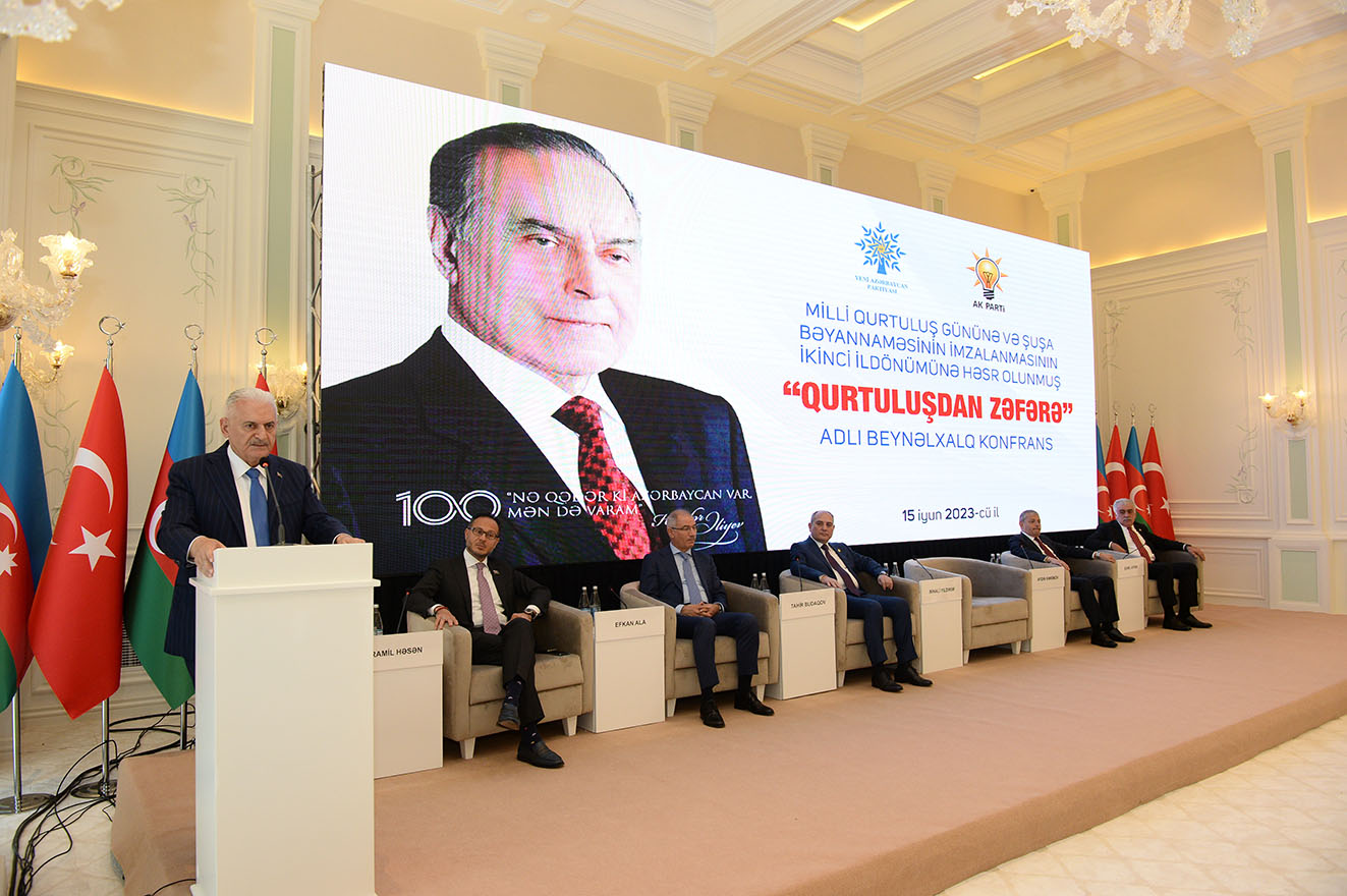 Çıxış edən Ədalət və İnkişaf Partiyası Sədrinin birinci müavini, Türk Dövlətləri Təşkilatı Ağsaqqallar Şurasının sədri Binəli Yıldırım bildirib ki, bu gün biz Şuşada 15 İyun – Milli Qurtuluş Gününü və Şuşa Bəyannaməsinin imzalanmasının ikinci ildönümünü qeyd edirik. “Qurtuluşdan Zəfərə” adlı beynəlxalq konfransda iştirak etməkdən qürur duyduğunu söyləyən Binəli Yıldırım “Dəvət üçün Yeni Azərbaycan Partiyasının rəhbərliyinə təşəkkür edirik. Türk dünyasının seçilən iki dövləti - Türkiyə ilə Azərbaycan arasındakı strateji əlaqələr daim zirvədə olacaq” ,- deyə vurğulayıb.