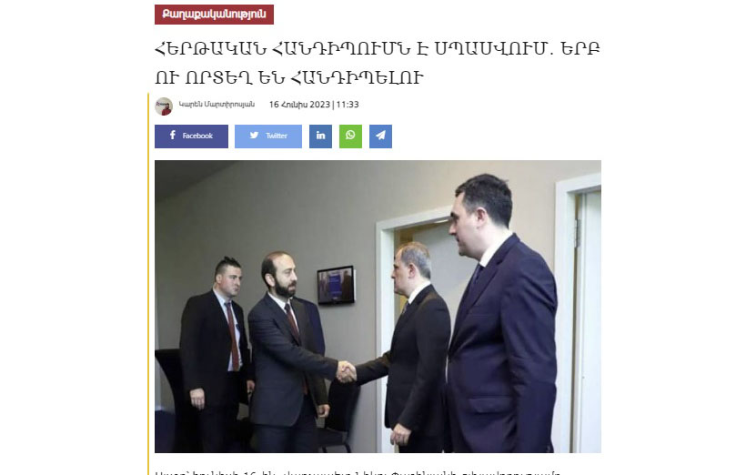 - Ermənistanın baş naziri Nikol Paşinyan hökumətin bu gün keçirilən iclasında Azərbaycan və Ermənistan xarici işlər nazirlərinin Vaşinqtonda yenidən görüşəcəklərinə əmin olduğunu bildirib. O, deyib: "Ümidvaram ki, növbəti Vaşinqton görüşündə gözlənilən müəyyən irəliləyişlər baş tutacaq. Bu daha çox Azərbaycan və Ermənistanın bir-birinin ərazi bütövlüyünü tanımasına dairdir".