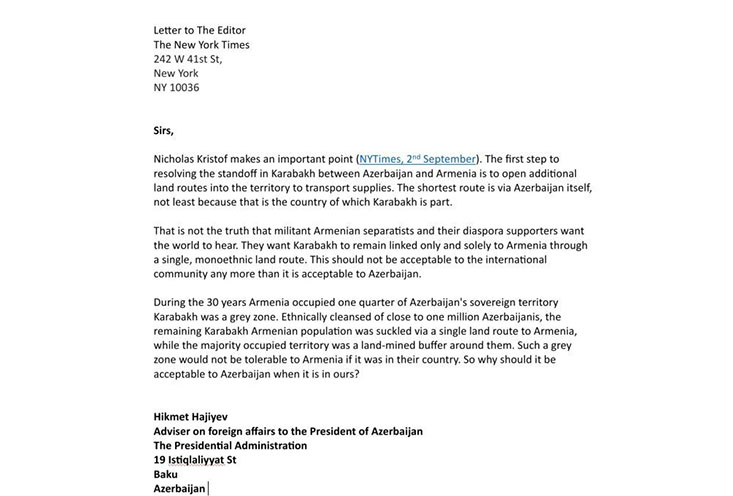 Bu məqalələrin hamısını, o cümlədən, NYT-ni yoxlayanda belə təəssürat yaranır ki, onların hamısı eyni hökumət studiyasında və ya erməni lobbisi və hökuməti tərəfindən maliyyələşdirilən PR şirkətində yazılıb”, - deyə paylaşımda bildirilib. (Trend)