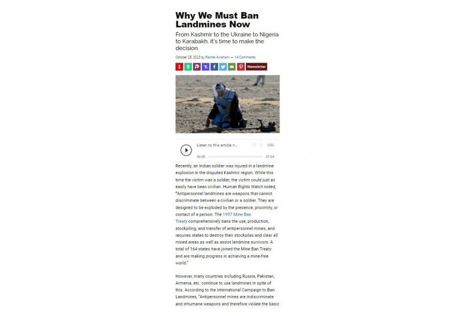 Bir sıra beynəlxalq siyasi ekspertlərin fikirlərinin yer aldığı “Niyə indi minaları qadağan etməliyik?” sərlövhəli məqalə diqqətə çatdırılıb ki, ermənilərin basdırdıqları minalarla bağlı problem olmasaydı, Azərbaycan tərəfi daha çox ərazini təmizləyib məcburi köçkünlərin öz evlərinə qayıdışını təmin etmiş olardı.