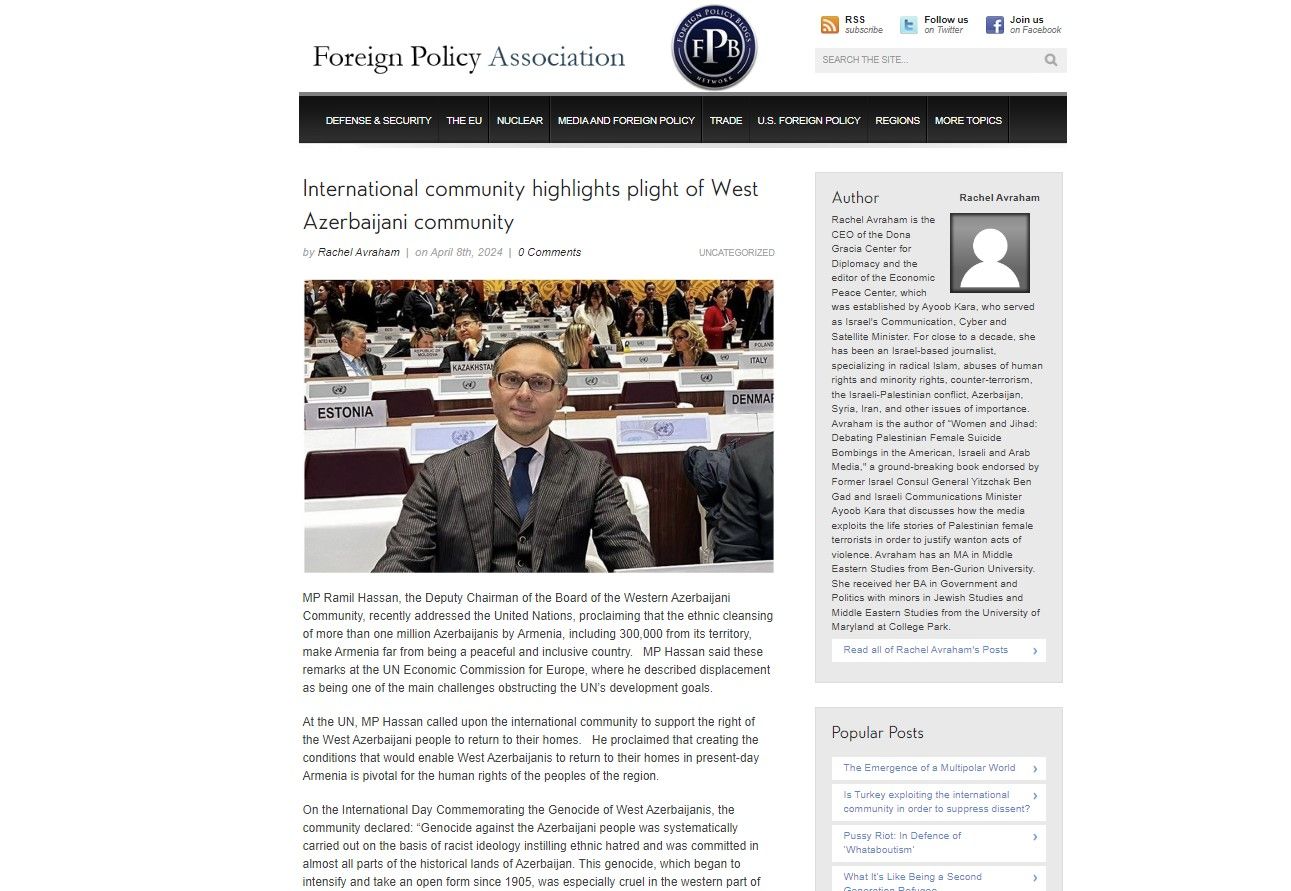 Diasporla iş üzrə Dövlət Komitəsindən bildirilib ki, bu barədə Dona Qrasiya Diplomatiya Mərkəzinin təsisçisi və baş direktoru, tanınmış siyasi şərhçi və jurnalist Reyçel Avraham baş qərargahı ABŞ-ın Nyu-York şəhərində yerləşən Xarici Siyasət Assosiasiyasının xəbər saytında dərc olunmuş məqaləsində yazıb. "Beynəlxalq ictimaiyyət Qərbi Azərbaycan icmasının acınacaqlı vəziyyətini işıqlandırır" sərlövhəli məqalədə qeyd olunub ki, Qərbi azərbaycanlıların nümunəsində əhalinin məcburi yerdəyişməsi BMT-nin inkişaf məqsədlərinə nail olunmasına mane olan əsas problemlərdəndir. Qərbi Azərbaycanlıların öz evlərinə qayıtmaq hüququnu dəstəkləməyə dair beynəlxalq ictimaiyyətə çağırışın edildiyi yazıda vurğulanıb ki, soydaşlarımızın indiki Ermənistanda öz evlərinə qayıtmasına imkan yaradacaq şəraitin yaradılması region xalqlarının insan haqları baxımından mühüm əhəmiyyət kəsb edir.