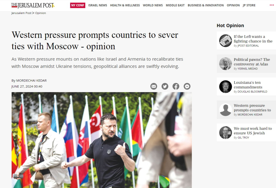 Bu fikri İsrailin ərəb dünyası və İran üzrə tanınmış eksperti, İsrail Müdafiə Qüvvələrinin Kəşfiyyat Korpusunun sabiq polkovnik-leytenantı, bu ölkənin nüfuzlu Bar-İlan Universitetinin şərqşünaslıq elmləri üzrə professoru və Universitetin Yaxın Şərq və İslam Tədqiqatları Mərkəzinin direktoru, Begin-Sadat Strateji Araşdırmalar Mərkəzinin tədqiqatçısı doktor Mordexay Kedar dünyanın ən nüfuzlu nəşrlərindən olan “Jerusalem Post”da dərc olunmuş “Qərbin təzyiqləri ölkələri Moskva ilə əlaqələri kəsməyə sövq edir” sərlövhəli məqaləsində yazıb.