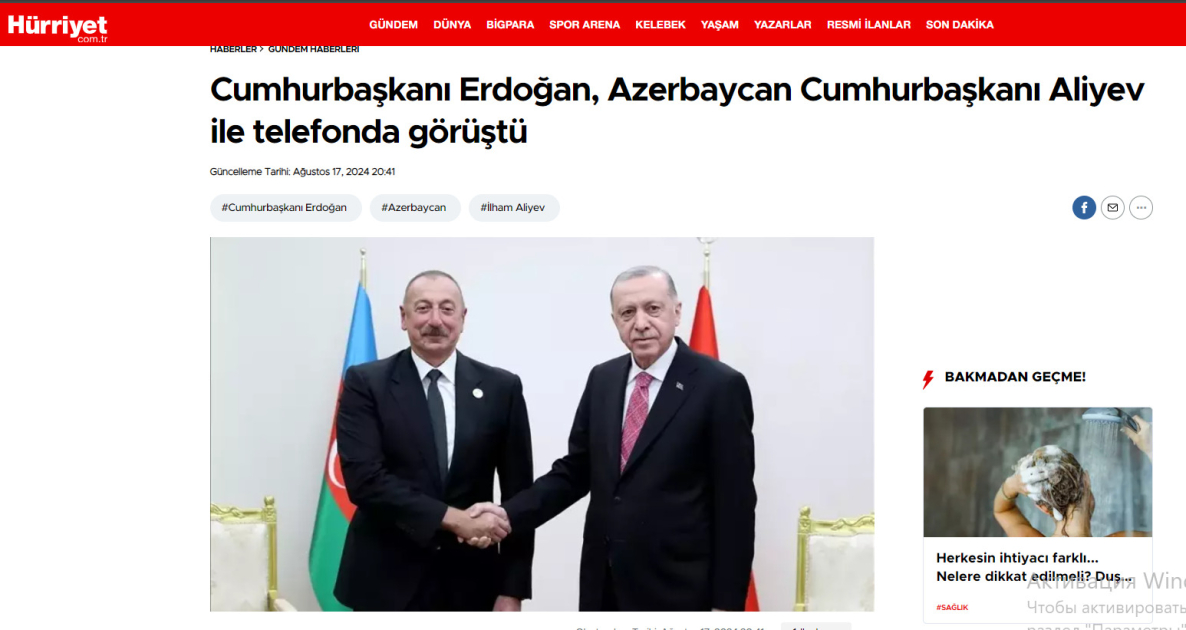 Türkiyə Prezidenti Rəcəb Tayyib Ərdoğanın Azərbaycan Prezidenti İlham Əliyevə zəngi etməsi ilə bağlı məlumat televiziya kanallarının xəbər buraxılışlarında yer alıb.