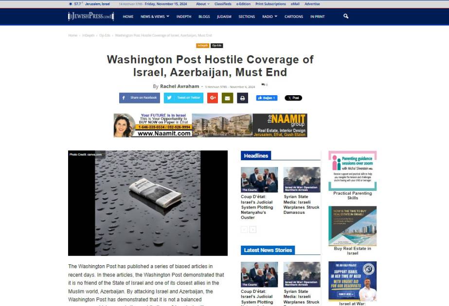 “Washington Post”un İsrail və Azərbaycanla bağlı düşməncəsinə yazılarına son qoyulmalıdır” başlıqlı məqalədə adıçəkilən qəzetdə son vaxtlar sözügedən ölkələrə münasibətdə qərəzli məqalələrin dərci məsələsinə toxunulub.